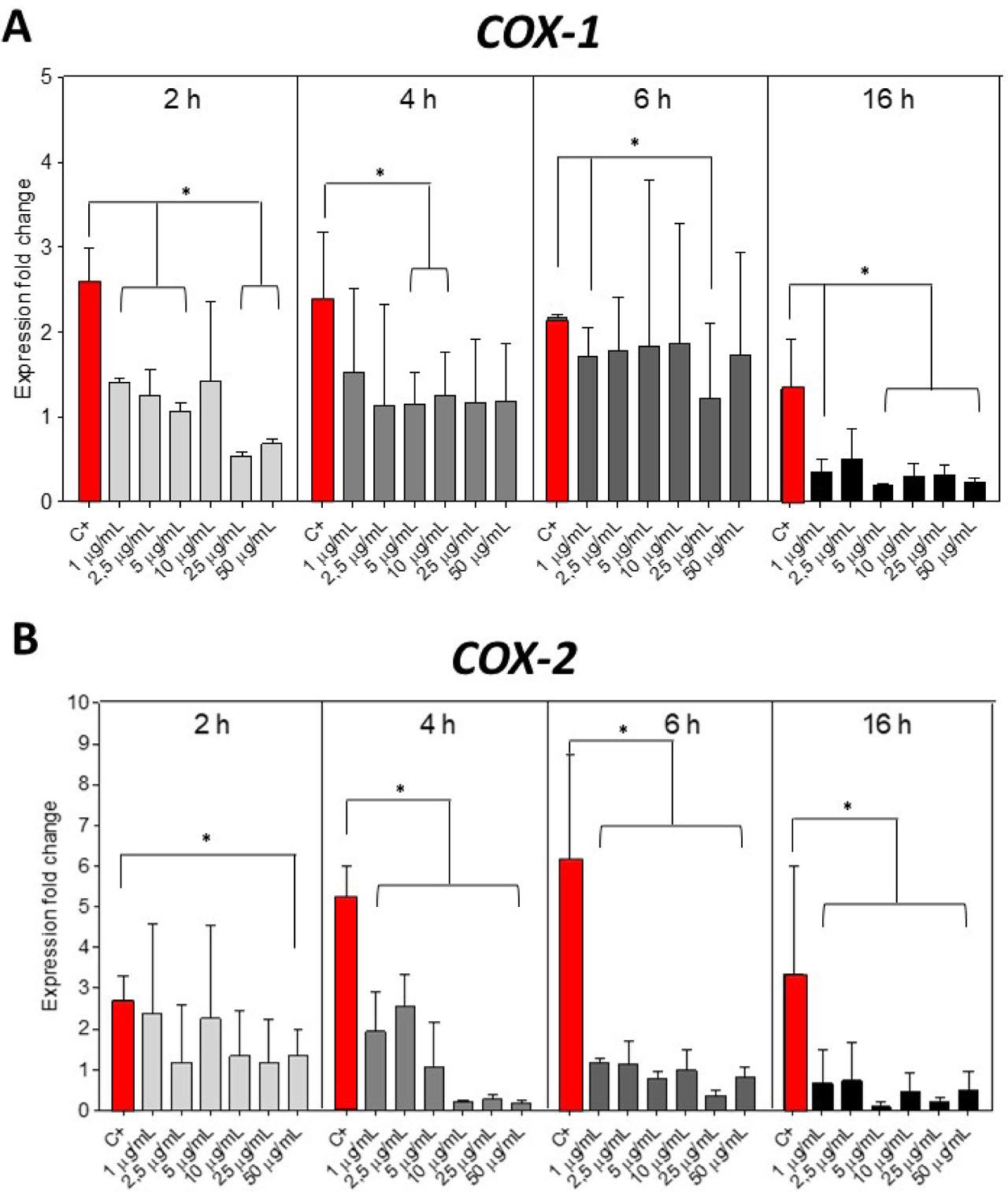 Changes in COX-1 (A) and COX-2 (B) gene expression in the U937 cells after 48 h pre-treatment with PMA (10 ng/mL), followed by 40 h of incubation without treatment, 4 h treatment with 1, 2,5, 5, 10, 25, and 50 μg/mL of LevidorTM as well as LPS addition (1 μg/mL) for 2, 4, 6, and 16 h. Results are presented as fold changes in the expression of investigated genes. Negative control (C−) refers to cells treated with PMA, while positive control (C+) relates to cells treated also with inflammatory inducer. Significantly different values are marked as (*) p ≤ 0.05. The results are calculated based on three independent experiments