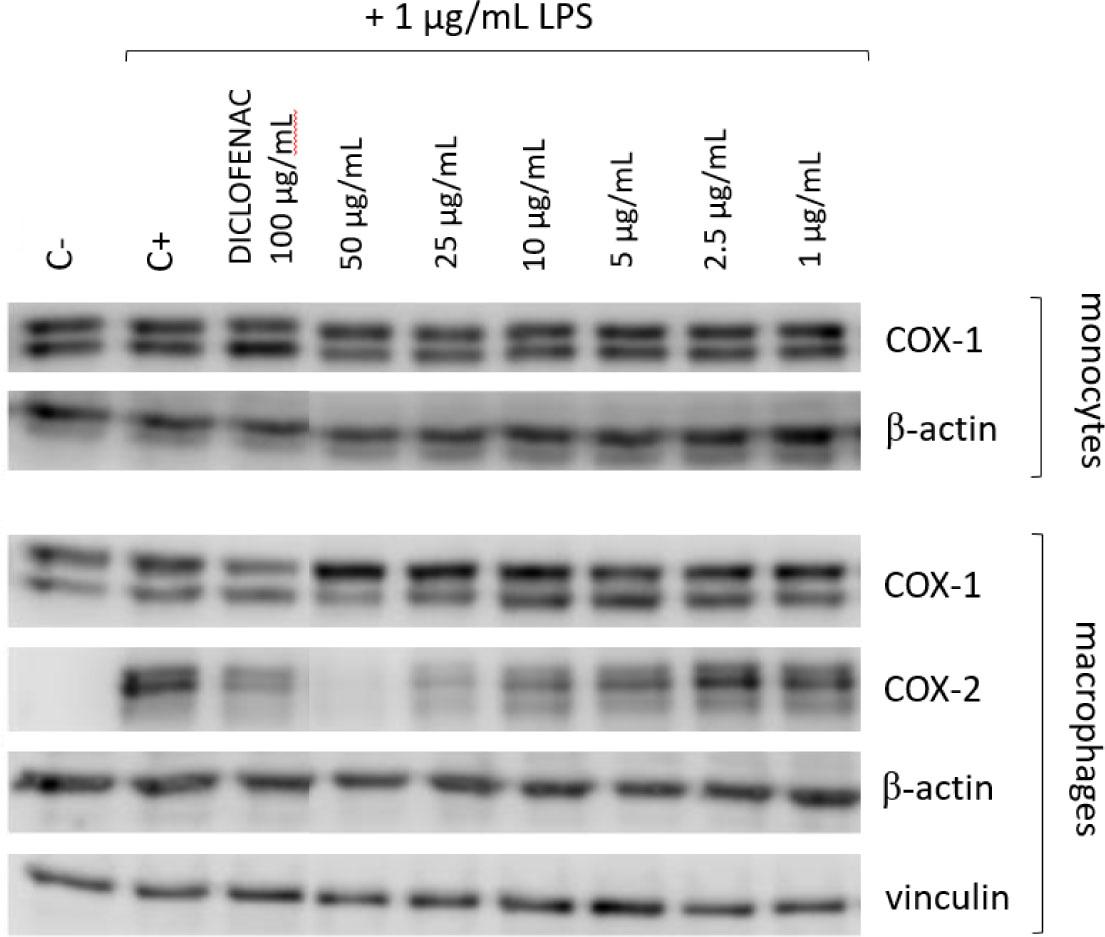 Subsequent to gene expression analysis, the determination of COX-1 and COX-2 protein level was performed (Fig. 3). The non- and differentiated U937 cells were treated with tested extract at concentrations ranging from 1 to 50 μg/mL. Western blot examination provided the confirmation of hypothesis that LevidorTM does not affect COX-1, while abundance of COX-2 protein decreases in a concentration dependent manner. Importantly, COX-1 level was not affected both in monocytes and macrophages. In turn, COX-2 level determined in macrophages treated with 50 μg/ml reduced protein level in comparison to negative control level. The concentrations 10 and 25 μg/ml of LevidorTM caused a similar effect on COX-2 as non-steroidal anti-inflammatory drug, namely diclofenac at 100 μg/mL. The lowest concentrations of the LevidorTM extract did not impact COX-2 protein level notably.