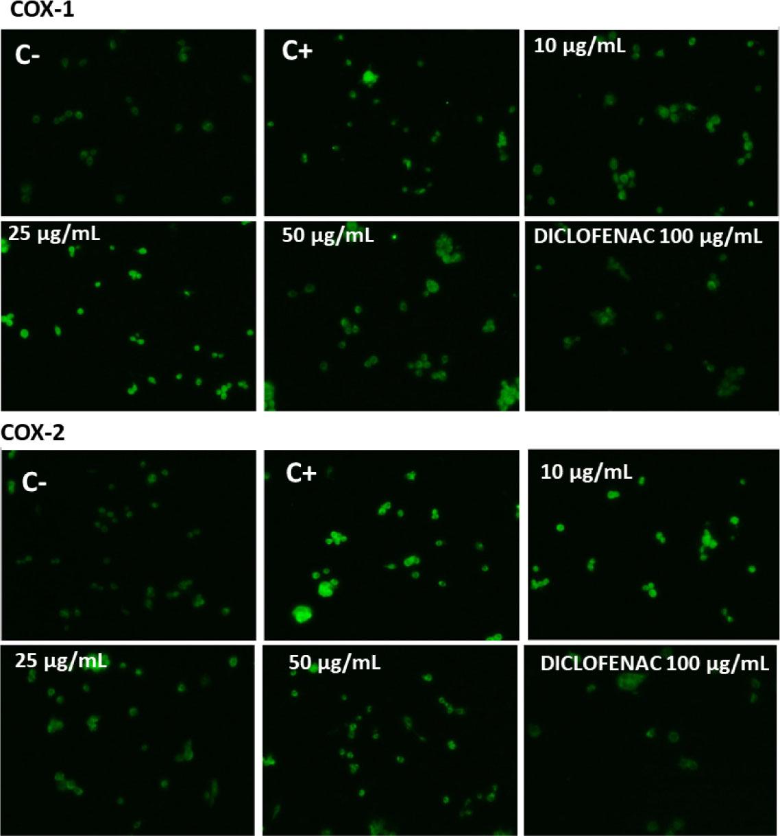 Immunofluorescence staining confirmed that LevidorTM extract did not cause drop in COX-1 protein level (Fig. 4). Conversely, it was observed that the extract potentiated fluorescence derived from COX-1. This effect was noted especially at 25 μg/mL. In the case of COX-2, the protein level was significantly decreased when compared to positive control. Such reduction exhibited dose dependent character similarly as it was observed in Western blot analysis.