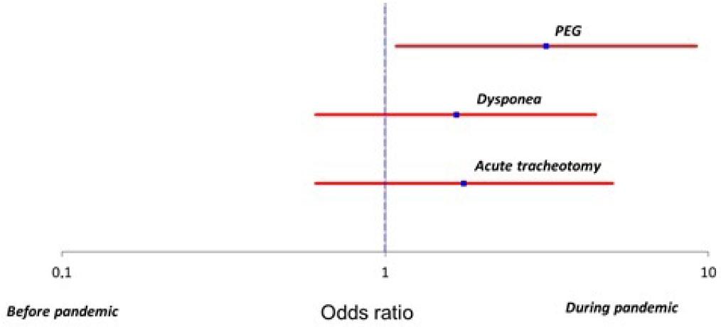 Odds ratio plot for PEG, dyspnoea, and acute tracheostomy with 95% confidence intervals