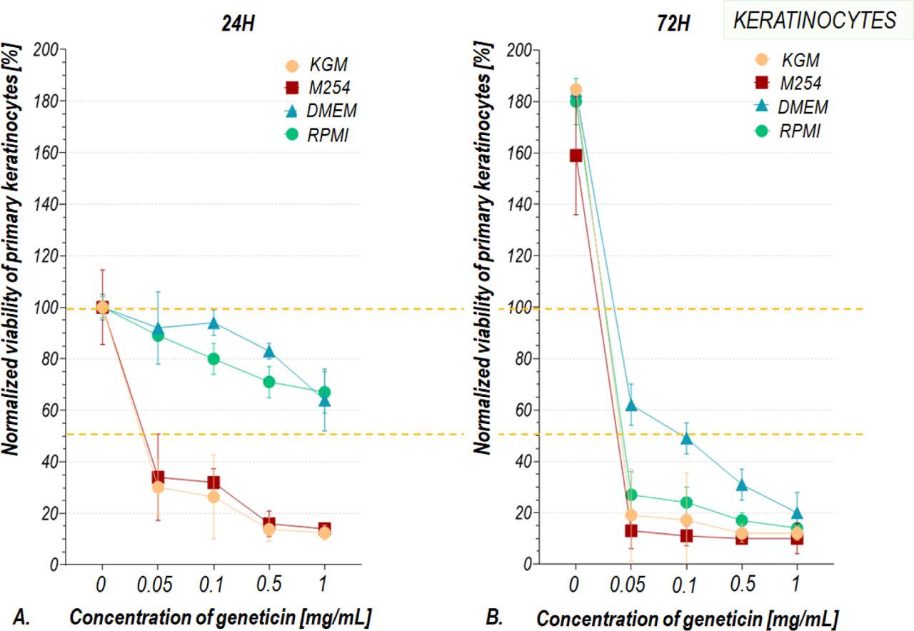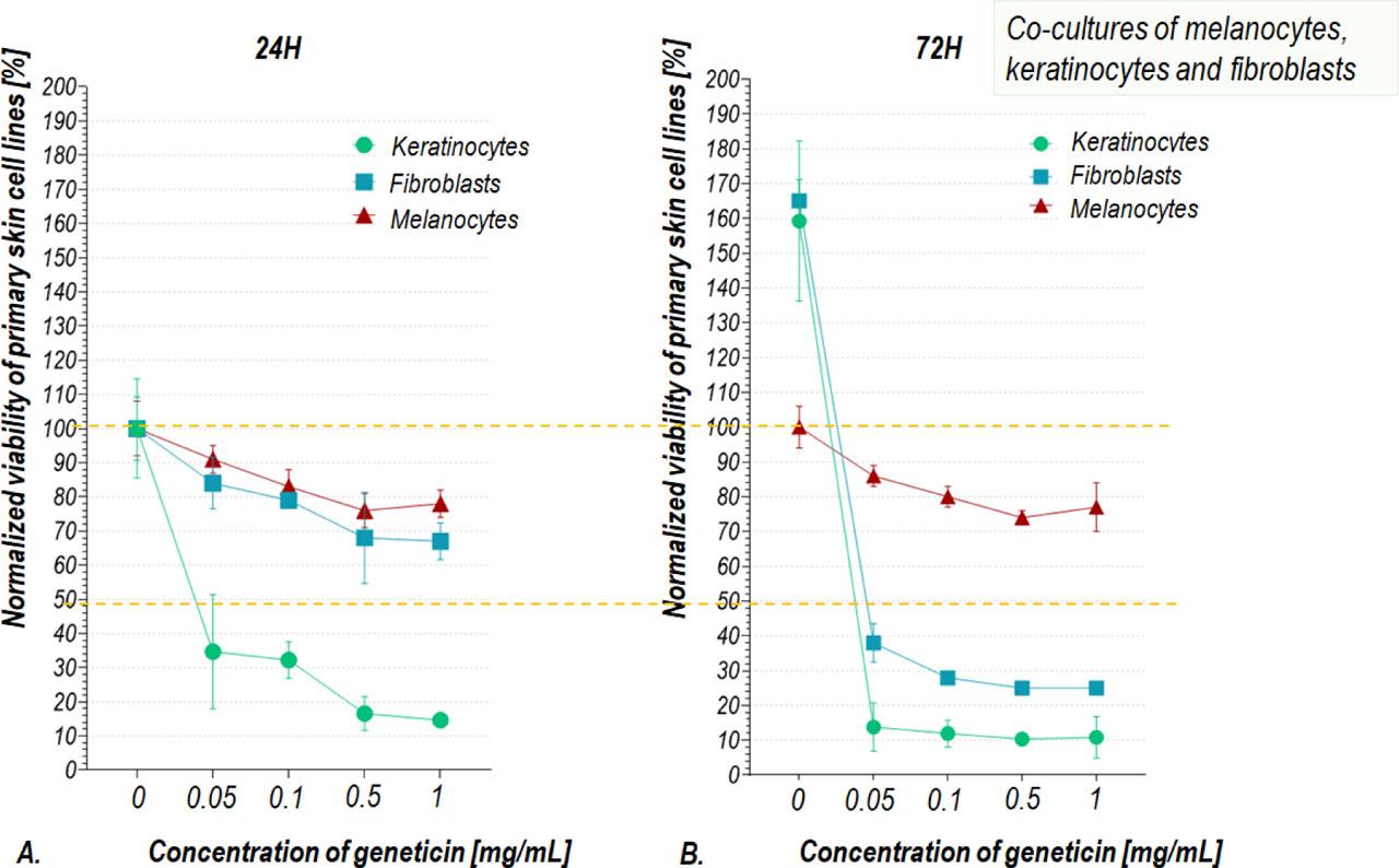 Viability of normal human skin cells, cultured in M254 culture medium, after cell culture stimulation with different concentrations of geneticin for 24 hours (A) and 72 hours (B)