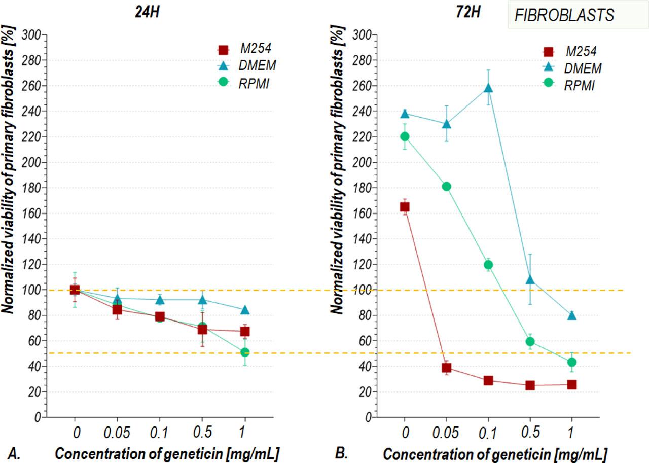 Then, we investigated whether geneticin will be toxic to fibroblasts cultured in media recommended for their propagation (including DMEM and RPMI, both with 10% FBS supplementation) (Figure 4). Incubation with higher doses of geneticin (0.5 – 1 mg/mL) has decreased the viability of fibroblasts in all cases (Figure 4) after 24 and 72 hours of cell stimulation. Lower doses of geneticin were not sufficient to reduce the viability of fibroblasts in this FBS-supplemented culture medium. On the other hand, the viability of fibroblasts was significantly lowered for all tested geneticin concentrations (0.05 – 1 mg/mL), when cultured in M254 medium (Figure 4A,B). Interestingly, even low concentrations of geneticin (0.05 mg/mL) has led to a significant reduction in cell viability observed after 72 hours of cell stimulation (p-value <0.0001) (Figure 4B).