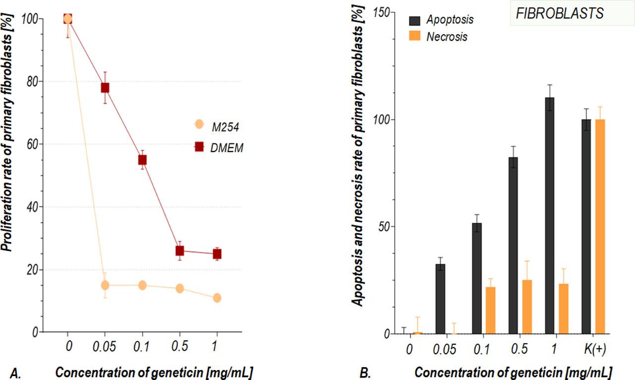 Geneticin in all concentrations tested was found to be toxic to keratinocytes regardless of the medium used for cell culture (Figure 3). Therefore, subsequent studies should concentrate on the selection of keratinocytes before stimulation with geneticin and different times of trypsinization [3]. Interestingly, the effectiveness of geneticin on the primary fibroblasts depended on the medium used for the cell culture; we found that geneticin-based elimination of fibroblasts from cells culture depends strictly on the implemented culture media. Indeed, depending on the culture medium composition, geneticin may have a variable effect on cell growth and proliferation rate. In some cell cultures treated with geneticin increased utilization of glutamine was observed, while in some other cell cultures, the flux of glucose instead of lactate production was common, towards pathways leading to provide energy or biosynthesis [16]. Fibroblasts cultured in DMEM medium supplemented with 10% FBS were found to be more resistant to various geneticin concentrations as compared to those cultured in Medium 254, even though without geneticin they were able to proliferate rapidly in this medium (Figure 2, 4). This result seems to be in line with other analyses published in 10 out of 12 publications that met the final search criteria. Stimulation with higher concentrations of geneticin, dissolved in culture media supplemented with various concentrations of FBS, had to be used, or treatment had to be repeated. Our results showed that fibroblast culturing conducted in medium M254 allowed for the reduction of the needed geneticin concentration in culture media up to 0.05 mg/mL (Figure 2,4).