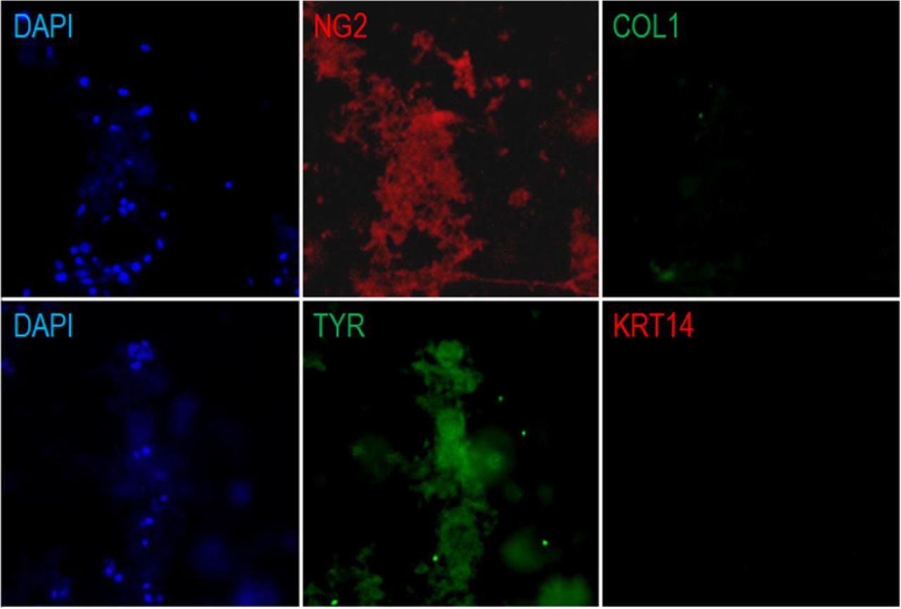 Immunofluorescence staining of melanocytes, keratinocytes and fibroblasts cultured in medium M254 for 72 hours after 0.05 mg/mL geneticin treatment. The nuclei of the cells were stained blue with DAPI. TYR and NG2 are markers of melanocytes, while COL1 and KRT14 are markers of fibroblasts and keratinocytes, respectively