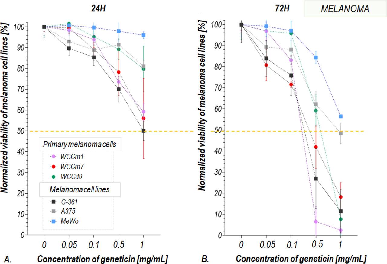 The MTT results of the influence of geneticin on the primary human metastatic melanoma cell lines (WCCm1, WCCm7, WCCd9) and commercial cell lines of metastatic melanoma (A375, G-361 and MeWo) observed 24 hours (A) and 72 hours (B) after cell stimulation in M254 culture medium