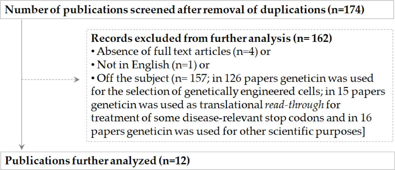 The National Center for Biotechnology Information Database (https://www.ncbi.nlm.nih.gov/, accessed 19 January 2023) was used for acquiring selected literature (n = 171). Search terms were: “Geneticin” combined with “Melanocytes” or “Keratinocytes” or “Fibroblasts”. Hand searches of relevant publications that were not discovered in the PubMed database provided additional sources of information (n=4).