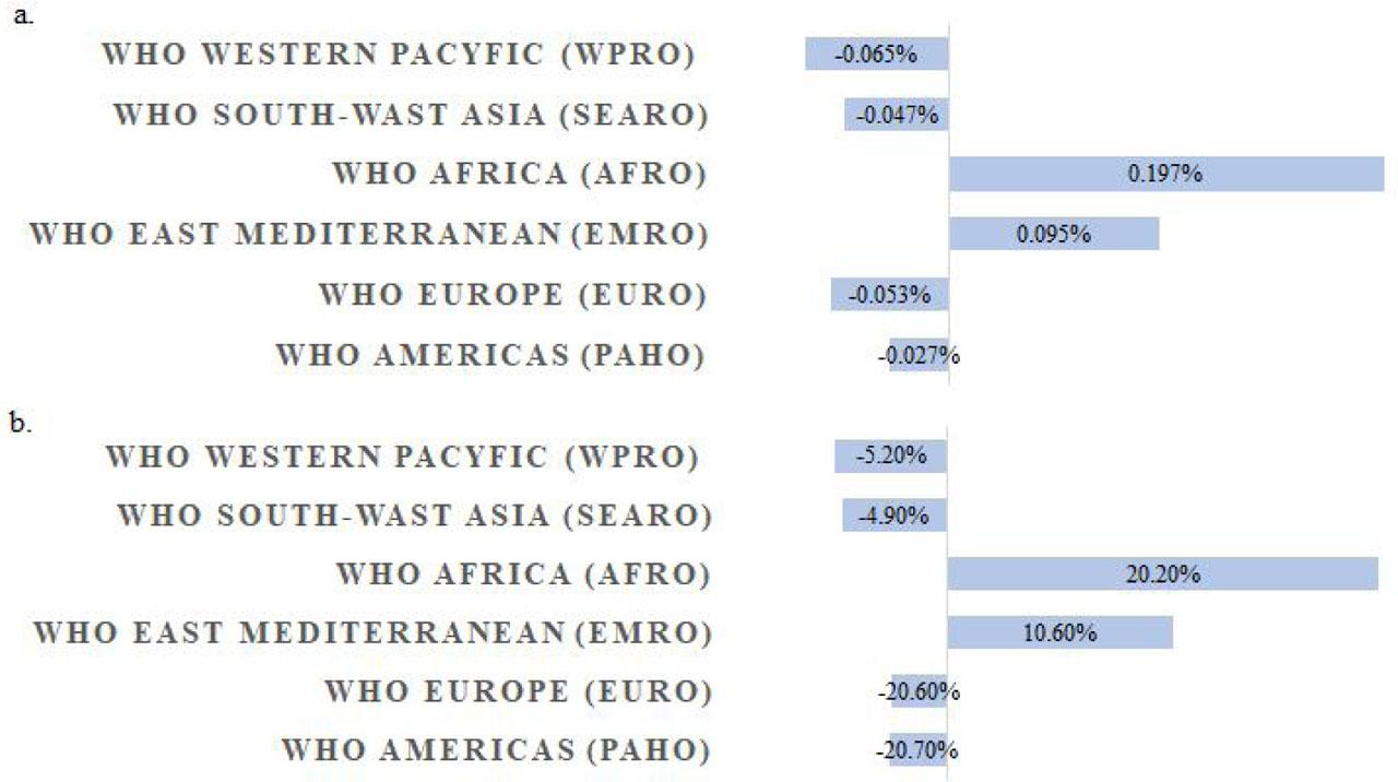 | WHO Americas | 44 % | 56 % | 41.5 % | 58.5 % |