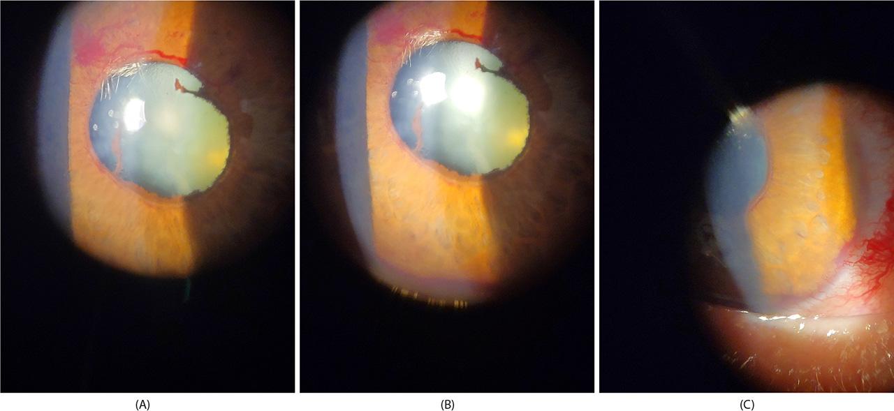 Biomicroscopy examination of the right eye showing prominent iris neovasculature (1A), hyphema (1B), and conjunctival injection (1C)