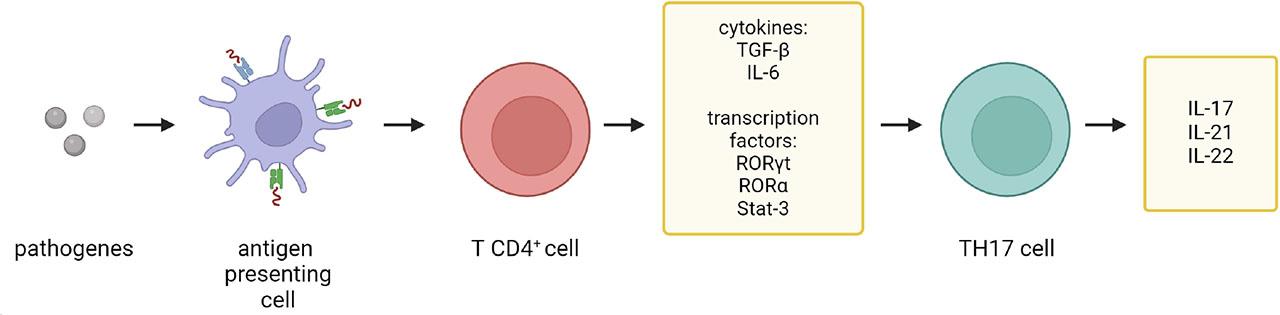 Th17 lymphocytes were first described by Aggarwala et al. in the early 2000s as the primary source of the IL-17 cytokine, hence the name [13]. It has been proven that in the differentiation of naive Th0 cells into Th17 lymphocytes, transforming growth factor beta (TGF-β) plays an important role, although to a lesser extent than in mouse models, along with IL-6 and IL-21 and IL-23, which exhibit the strongest effects. In the process of Th17 lymphocyte differentiation, the IL-23 receptor plays a significant role in response to the combined activity of IL-1β and IL-23. Additionally, it is believed that alongside the aforementioned factors, IL-1β and IL-2, which have auxiliary functions, as well as the RORγt transcription factor and signal transducer and activator of transcription 3 (STAT3), may play important roles [15, 18].