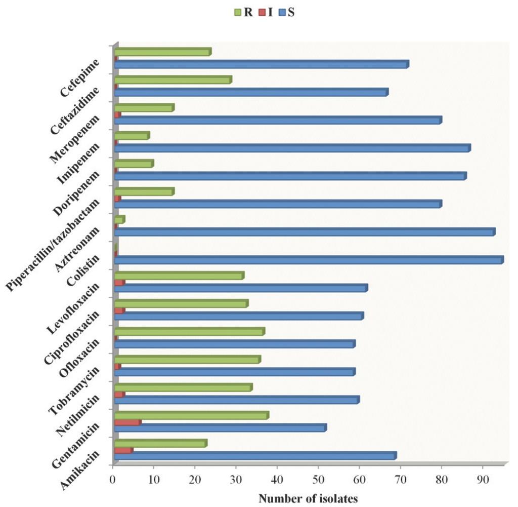 Susceptibility to 15 antibiotics from different classes such as aminoglycosides (amikacin, gentamicin, netilmicin and tobramycin), fluoroquinolones (ofloxacin, ciprofloxacin and levofloxacin), polypeptides (colistin), penicillin combination (piperacillin/tazobactam), monobactams (aztreonam), cephalosporins (ceftazidime and cefepime), and carbapenems (doripenem, imipenem and meropenem) was tested in all isolates. Figure 1 shows that all isolates were sensitive to colistin, and most to aztreonam (97.87 %), imipenem, and doripenem (91.49 % and 90.43 %, respectively), while 84.04 % of the isolates were susceptible to meropenem and the piperacillin/tazobactam combination. These findings single out colistin as antibiotic of choice, but only as a last resort due to its neurotoxicity (34).
