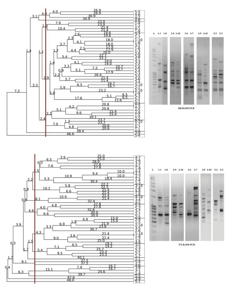 Dendrogram obtained by UPGMA analysis of the selected Pseudomonas isolates using 208 (top) and 272 (bottom) primers, based on RADP profile (right). Genetic distances were presented with numbers placed on the branches. Rectangles are representing the isolate grouping according to obtained RAPD patterns