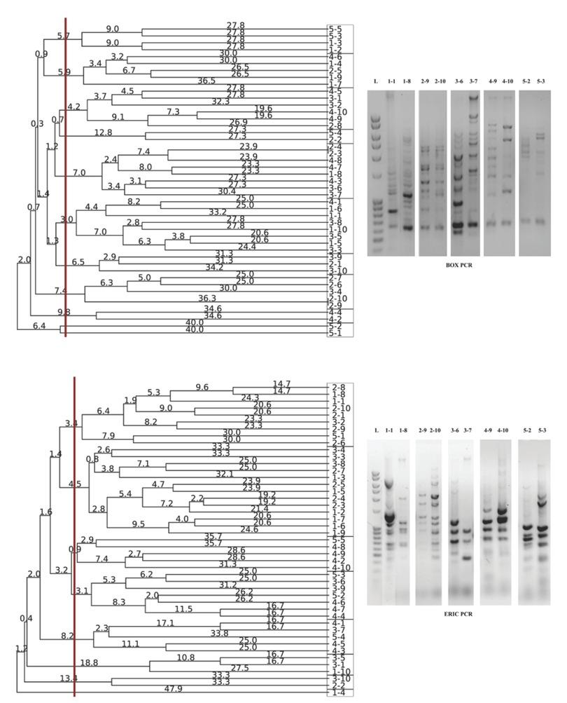Dendrogram obtained by UPGMA analysis of the selected Pseudomonas isolates using BOX (top) and ERIC (bottom) primers, based on rep-PCR profile (right). Genetic distances were presented with numbers placed on the branches. Rectangles are representing the isolate grouping according to obtained rep-PCR patterns
