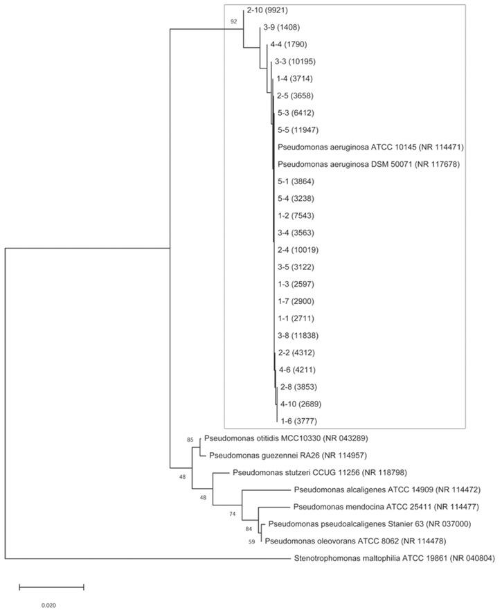 Additionally, BOX and ERIC primers used in rep-PCR analysis created between five and 17 fingerprinting patterns of different sizes, ranging from 100 bp to 5000 bp. BOX PCR allocated a total of 10 clusters, indicating a good primer-discriminatory power, while ERIC PCR provided a total of eight clusters (Figure 3). As in RAPD analysis, the BOX PCR clusters were extremely heterogeneous, except for a few homogeneous clusters. The results of the BOX PCR analysis, like in RADP profiling, showed pattern uniformity of different antibiotic resistance groups, but certain clusters were heterogeneous. For instance, BOX PCR split the largest cluster obtained with primer 272 into four separate clusters. Pattern uniformity between isolates from the same resistance group within some clusters was also verified. The similarity between BOX and 272 primers was observed in terms of pattern uniformity between isolates from the first MDR group and those from the second and fourth group, as well as between the isolates from the fourth and fifth group. Another correlation was observed in pattern dissimilarity between isolates from the fourth and the second group, while isolate 5-1 was the most distant one genetically, as in BOX PCR analysis. ERIC PCR analysis generated more homogeneous isolate clustering from different antibiotic groups (mainly the second and the third group), and allocated a total of eight clusters. Unlike other tests, ERIC PCR showed pattern uniformity between the most susceptible isolates (the fifth group) and the second, third, and fourth group. Since RAPD272 PCR analysis provided the best characterisation with 12 clusters, we selected a few representative isolates from each cluster for 16S rRNA gene identification and all were identified as P. aeruginosa strains, which confirmed their genetic heterogeneity (Figure 4).