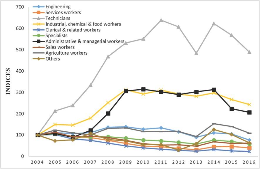 | Occupations | 2004 | 2005 | 2006 | 2007 | 2008 | 2009 | 2010 | 2011 | 2012 | 2013 | 2014 | 2015 | 2016 |