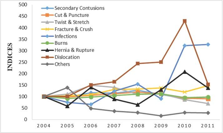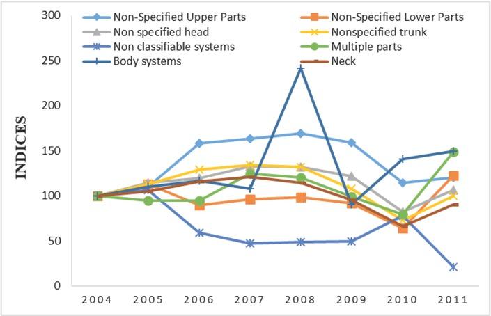 | Injured body parts | 2004 | 2005 | 2006 | 2007 | 2008 | 2009 | 2010 | 2011 | Slope |