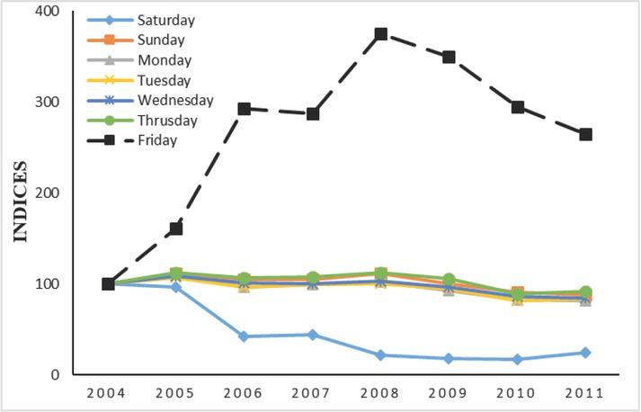 | Day | 2004 | 2005 | 2006 | 2007 | 2008 | 2009 | 2010 | 2011 | Slope |
