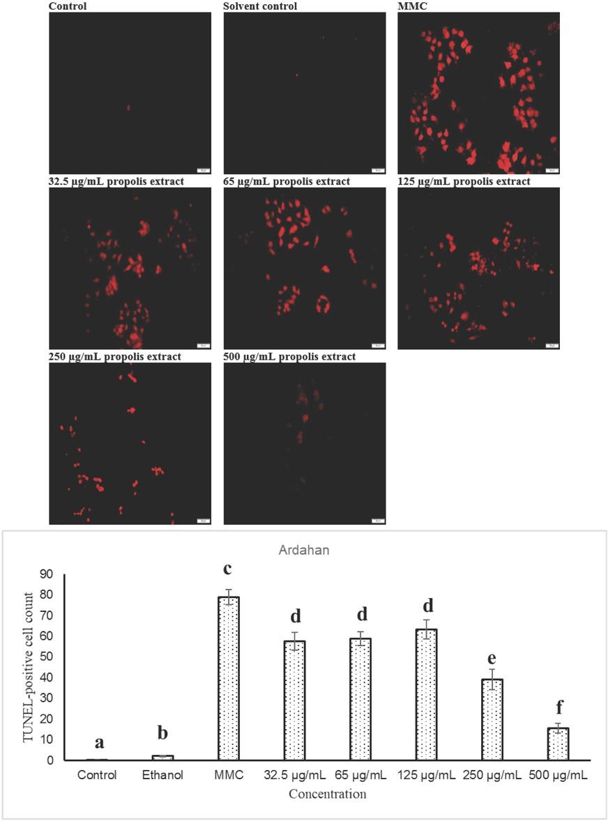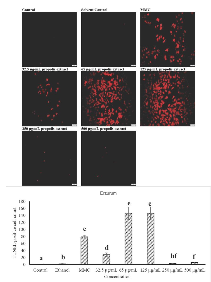 Figures 1 and 2 show the anticarcinogenic potential of A. m. caucasica propolis extracts from both provinces on MCF-7 human breast cancer cell line. The most effective concentrations were 65 and 125 μg/mL, and the Erzurum propolis was significantly more potent at these concentrations than even MMC, let alone the Ardahan propolis. A similar pattern was reported for propolis from East Java, Indonesia (78), and Turkish propolis samples collected from the Sakarya, Kemaliye, Çanakkale, Van, Yalova, and Ankara provinces (79). The latter report suggests that lower propolis concentrations seem to trigger the extrinsic apoptotic pathway by inducing caspase-8 activity, while higher concentrations cause necrotic death, which cannot be detected by the TUNEL assay. Similarly, Szliszka and Krol (80) suggest that flavonoid and phenolic components in propolis cause apoptosis in cancer cells by increasing the TNF-related apoptosis-inducing ligand (TRAIL) activity, which is associated with caspase-8 activity. Another study (81) showed that caffeic acid phenethyl ester in propolis can trigger the extrinsic apoptotic pathway by inducing TRAIL activity in human hepatocellular carcinoma cells. There is also evidence that cinnamic acid derivatives found in propolis, such as artepillin C, baccharin, and drupanin, induced both extrinsic and intrinsic apoptotic death in human colon cancer cells (82).