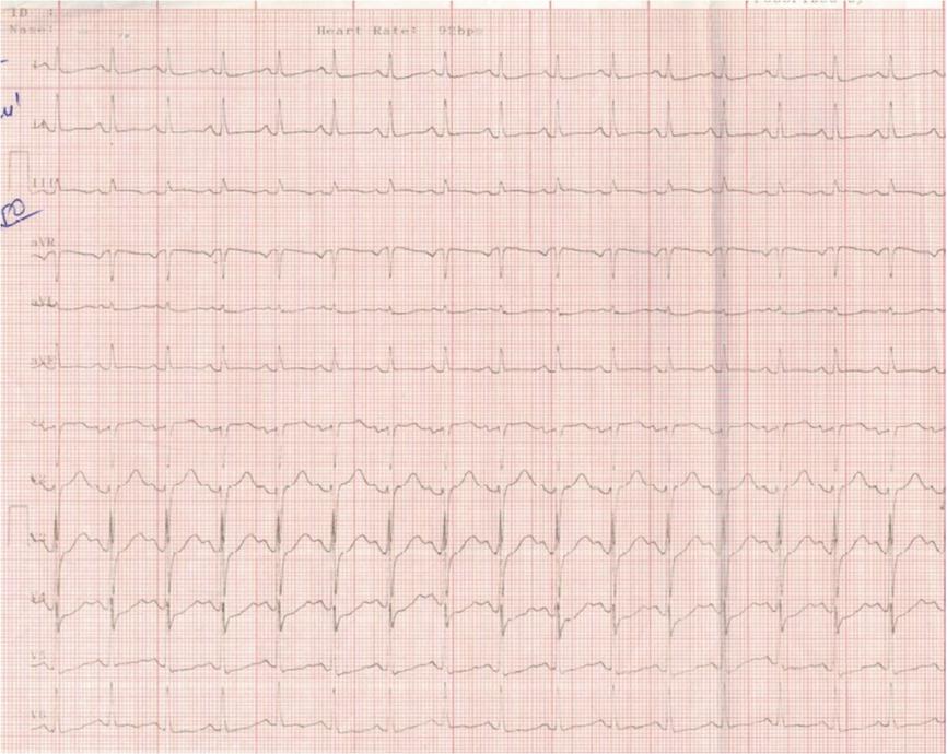 Electrocardiogram monitoring showing acute STEMI in inferior territory. ECG 26 hours after admission showed important ST segment elevation in leads DII, DIII, aVF, with S-T segment depression in aVL, flat T waves in DI, and V6, and sinus tachycardia