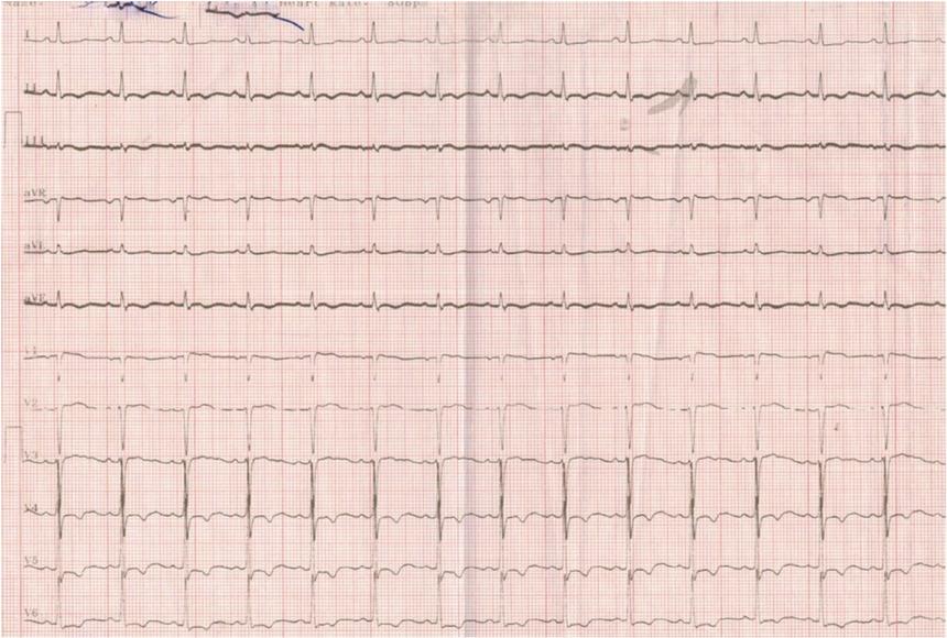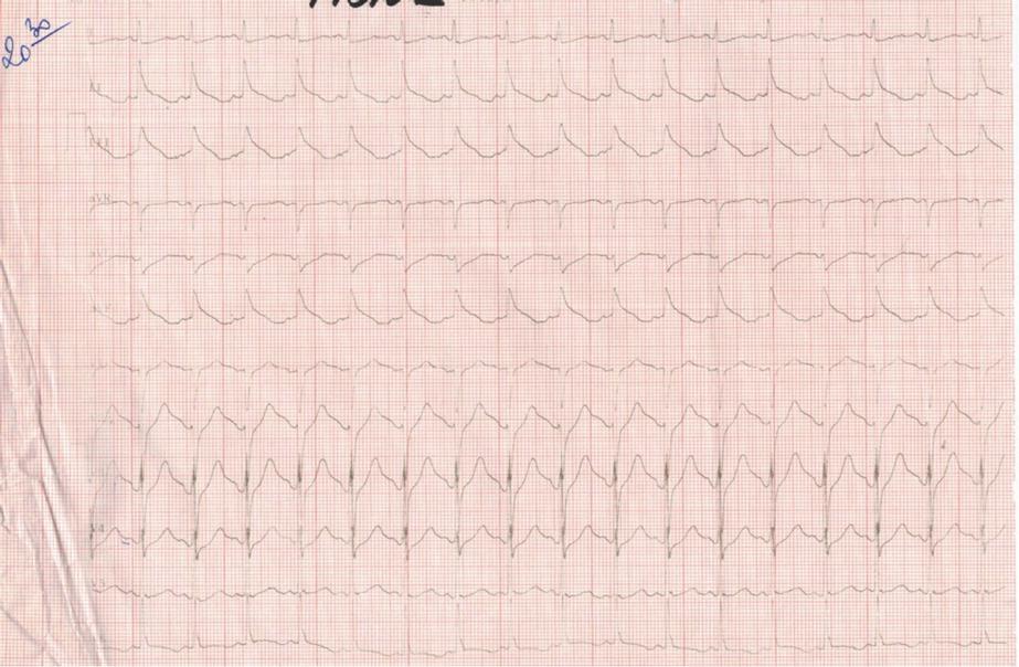 A 61-year-old woman was brought to the emergency department (ED) by ambulance one hour after accidental ingestion of an unknown quantity of OP solution from a bottle she confused for a drink. She came from a rural area where she had worked in agriculture and had been occupationally exposed to OP, carbamate, and organochlorine pesticides through inhalation and skin contact for 10 years. She had a history of surgery for post-traumatic subdural haematoma three years before the accident, without other known cardiovascular risk factors. She presented with clinical signs and symptoms of dizziness, myosis, excessive sweating, hypersalivation, sphincteric incontinence, muscle fasciculation, tremor of the extremities, pale skin, and alcoholic and pesticide breath odour. Her Glasgow Coma Scale was 9, and she was uncooperative, which made taking clinical history very difficult. Her initial blood pressure was 200/100 mmHg, and the first ECG in the ED showed narrow QRS-complex tachycardia with a heart rate of 122/min. Arterial blood gas analysis revealed lactic acidosis (pH 7.26), lactate 6.3 mmol/L, bicarbonate 18.8 mmol/L, potassium 2.5 mmol/L, calcium 1.05 mmol/L. Laboratory findings detected leukocytosis (16.93x103/μL), neutrophilia (13.9x103/μL), hyperglycaemia (12.71 mmol/L), and an ethanol level of 215 mg/dL. Relative reference ranges of our laboratory are: white blood cells 4–10x103/μL, neutrophils 2–8x103/μL, glucose 4.55–5.55 mmol/L, and ethanol <10 mg/dL. Cardiac markers were also elevated upon ED admission: creatine kinase (CK) was 412 U/L (reference range 20–170 U/L), CK myocardial band (CK-MB) 73 U/L (ref. range 2–25 U/L), lactate dehydrogenase (LDH) 292 U/L (ref. range 135–214 U/L), N-terminal pro-brain natriuretic peptide (NT-proBNP) 524 pg/mL, cardiac troponin I (cTnI) 1.75 ng/mL (ref. range 0–0.02 ng/mL), and GOT 32 U/L (ref. range 5–32 U/L). The plasma cholinesterase level was 279 U/L (range 5320–12920 U/L). Other biological parameters were within normal ranges.