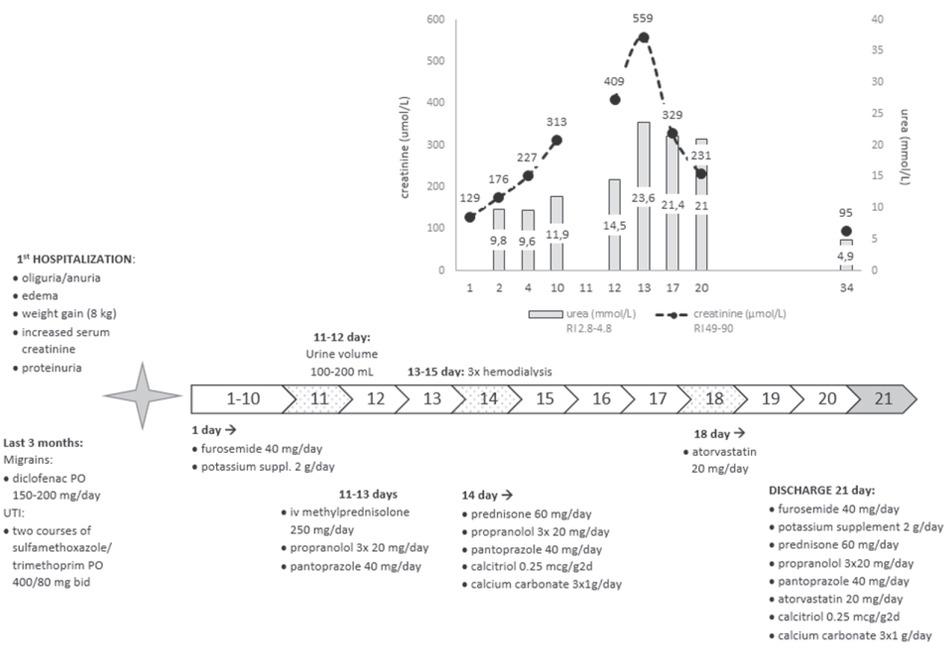 All the while she suffered from frequent migraine headaches. A neurologist successfully managed it with a beta-blocker propranolol (3x20 mg/day) throughout hospitalisation. Twenty days following admission, the patient’s creatinine level dropped to 231 μmol/L, and daily urine output kept around 2000 mL, but nephrotic proteinuria persisted (11 g/24-hour urine). On day 21 of hospitalisation, she was discharged and prescribed the following oral therapy: furosemide 40 mg/day, prednisone 60 mg/day, pantoprazole 40 mg/day, propranolol 3x20 mg/day for migraines, atorvastatin 20 mg/day for dyslipidaemia, and calcitriol 0.25 μg every other day in combination with calcium carbonate 3x1g/day (Figure 1).