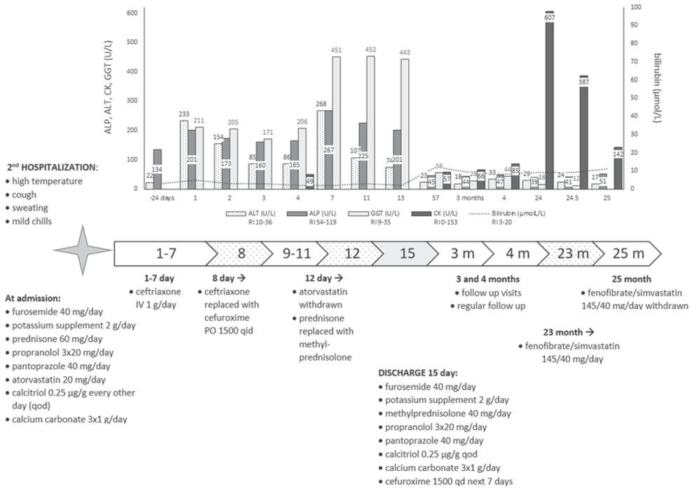 On day seven of hospitalisation, GGT and ALP increased significantly (452 U/L and 255 U/L, respectively), while ALT dropped to 107 U/L but remained well above the RI. Physicians reviewed the patient’s laboratory findings from the previous hospitalisation of two weeks earlier and discovered that ALP had slightly increased to 134 U/L two days after the IV methylprednisolone pulse therapy and that bilirubin levels had been low (2–3 μmol/L). This is what prompted them to check all the patient’s medications for potential liver toxicity. Assuming drug-induced liver injury (DILI), they replaced ceftriaxone with oral cefuroxime (1500 mg qid), and prednisone with methylprednisolone, and discontinued atorvastatin treatment.