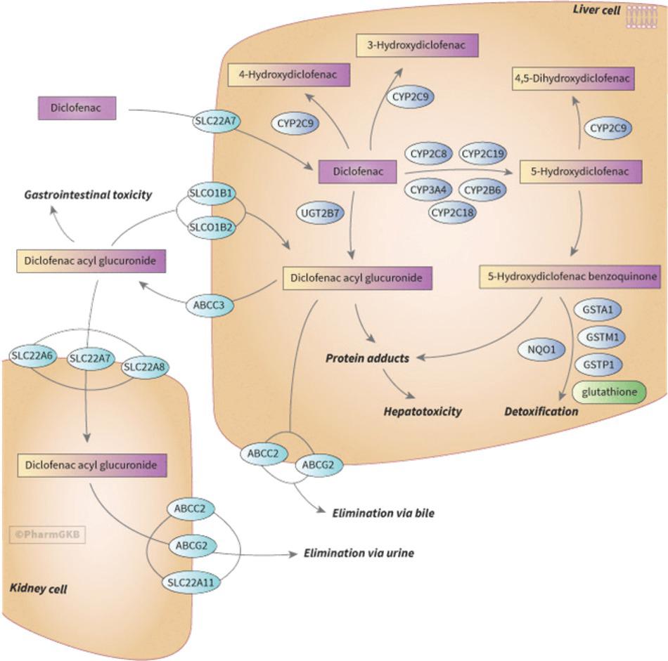 Diclofenac transport and metabolism (adopted from PharmGKB pathway images at https://www.pharmgkb.org/pathway/PA166163705 under the Creative Commons BY-SA 4.0 license)