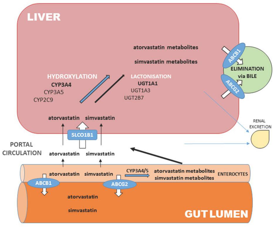 Of the drug transporters, P-glycoprotein (encoded by MDR1/ABCB1) and BCRP/ABCG2 (encoded by ABCG2) mediate intestinal and biliary efflux of statins (38, 39), while OATP1B1 has a central role in hepatic uptake (40, 41, 42).