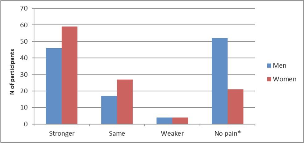 Significantly fewer women than men reported no pain in any analysed body part (Figures 1–3).