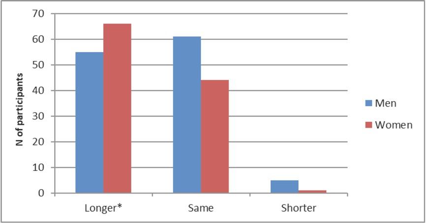 Over a half (52.2 %) of all participants estimated that they worked longer hours than in the office, significantly more women than men (Figure 4).