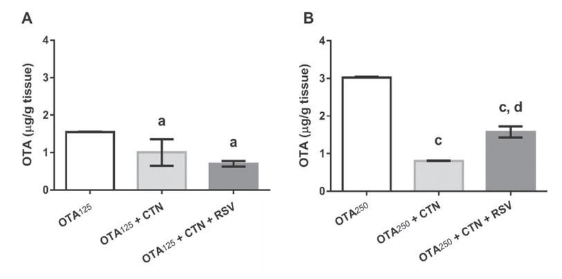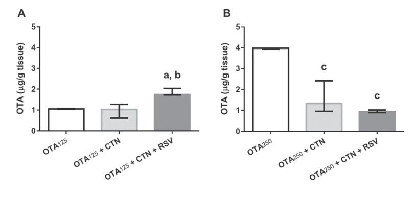 RSV did not lower OTA levels in animals receiving OTA+CTN+RSV compared to those receiving OTA+CTN regardless of the OTA dose. In fact, it increased kidney OTA in the OTA250+CTN+RSV group and liver OTA in the OTA125+CTN+RSV group.