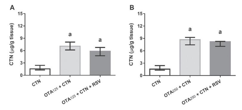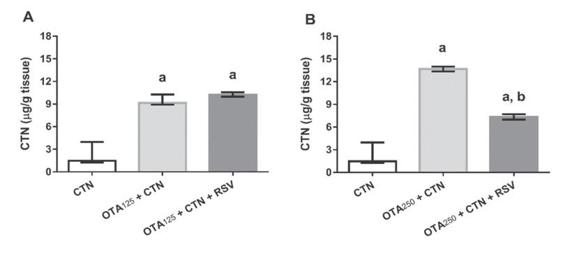 Kidney citrinin levels in rats treated with OTA doses of 125 μg/kg bw (OTA125) or 250 μg/ kg bw (OTA250) alone or in combination with citrinin (CTN) and resveratrol (RSV), both in the dose of 20 mg/kg bw. a different from CTN alone; b different from OTA250+CTN (P<0.05)