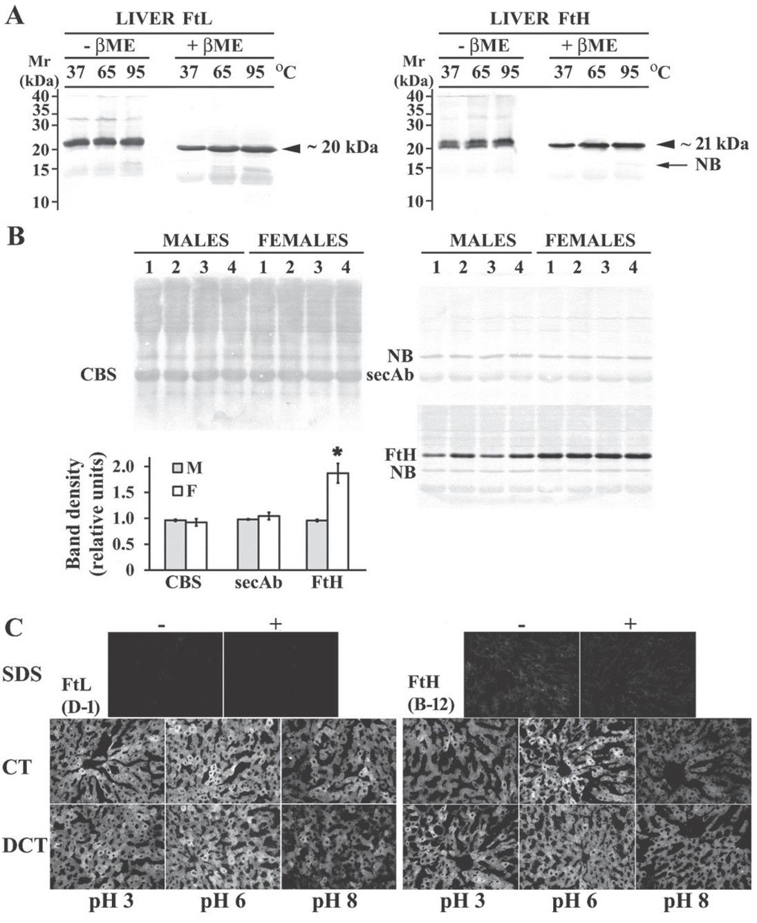 Liver ferritin immunochemistry conditions during procedure optimisation. (A) Sample preparation for Western blotting in reducing and nonreducing conditions at three temperatures that all yielded a strong and sharp protein band of 20 kDa for FtL and 21 kDa for FtH; (B) Western blotting for protein load – livers of 3-month-old male and female stained with Coomassie blue staining (CBS). PVDF membrane was incubated only with secondary antibody (secAb) followed by FtH antibody reincubation. Densitometric result between CBS samples and secondary antibody nonspecific band (NB) staining did not show difference vs protein band after FtH staining; (C) Antigen retrieval conditions for immunofluorescent staining for both ferritin antibodies. No staining was observed either without retrieval or with sodium dodecyl sulphate (SDS). Microwave cooking in citrate buffer (CT) with different pH gave best results for both ferritin antibodies at pH 6. Sham deparaffinisation with organic solutions and alcohol prior to cooking in citrate buffer (DCT) did not increase staining intensity