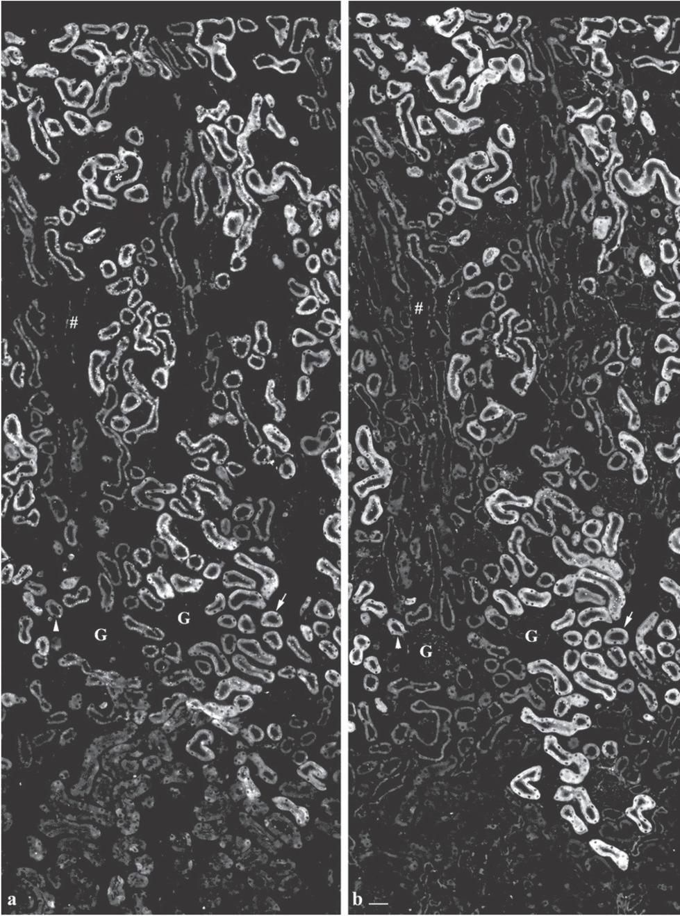 Kidney panels with parallel ferritin staining in consecutive cryosections of female kidney. Immunofluorescence of FtL (a) and FtH (b) shows stronger staining in epithelial cells of proximal tubules throughout the cortex and much weaker and mosaic staining in the outer stripe of kidney zones. Proximal tubules showed homogenous intracellular staining, whereas some S1 and S2 segments showed relatively dotty and faint (a, FtL) to strong (b, FtH) staining. Arrowheads on both panels show S1 segment of the proximal tubule (a, b) leaving juxtamedullar glomeruli (G). On the b panel S2 segments show homogenous and strong staining (arrow in G proximity). Faint (a,b) and mosaic staining (a) was observed in S3 segments (bottom of panels below G). Many proximal tubules contained ferritin-positive vesicles in the cells and in the lumen (asterisk in the S2 segment). This was found for both chains in the same cells/tubules of consecutive cryosections (a and b panels). However, FtH was more prominently stained in structures such as intercalated cells in the collecting duct (ladder) and weakly in the thick ascending limb of Henley (tubule to the left above the ladder). Bar=50 μm