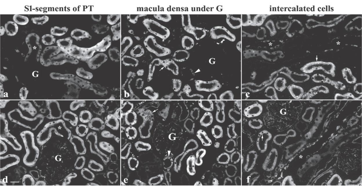 The role of iron in kidney diseases has recently been emphasised, and more precise localisation of ferritin throughout the kidney may tell us more about its functions in (pato)physiology (5, 25, 26, 27, 28). However, protein expression in organs detected by western blotting in our study has yet to be confirmed by in situ distribution in order to reveal a more precise expression pattern.