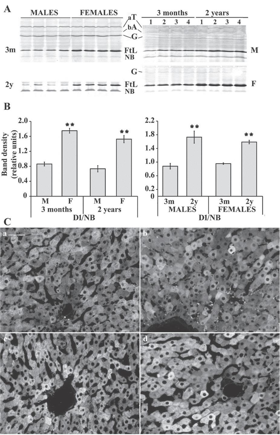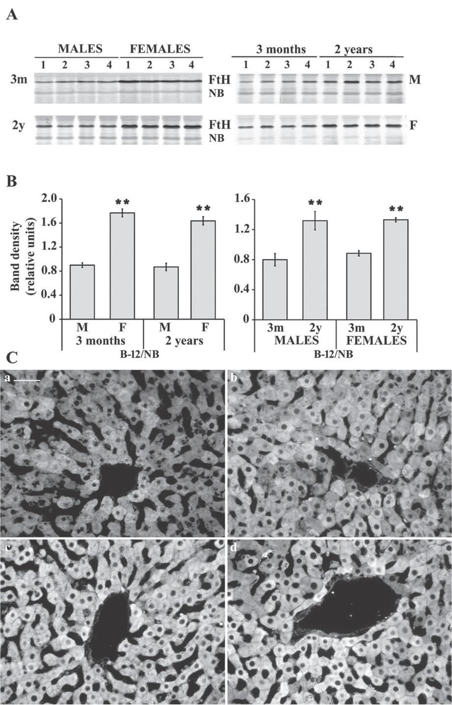 Considering previous research of age and sex differences in ferritin expression (9, 10, 11, 12, 13, 14, 15, 16, 17, 18), our study has confirmed its dependence on age, sex, and steroid hormones for both chains in the liver and kidney of 3-month and 2-year-old male and female Wistar rats.