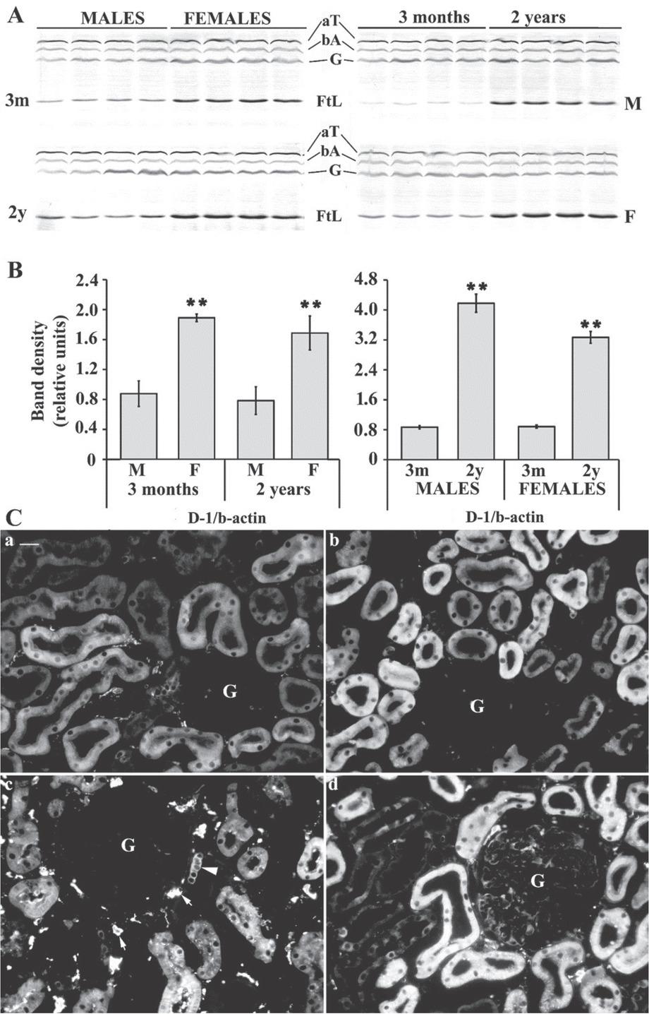 Immunochemistry of the light ferritin chain in the kidney. Western blotting with D-1 antibody against FtL (A) followed by densitometric evaluation (B) of the protein bands labeled in kidney tissue homogenates. F t L immunostaining in cryosections of the kidney tissues of three-month (3m) and two-year (2y) old male (M) and female (F) rats (C). The strong protein band represents FtL and was used for densitometric evaluation in relation to beta-actin (bA). Each band represents FtL protein expression in tissue homogenates from individual animals. Higher expression of FtL is visible in female rats regardless of age and in 2-year-old male and female animals. Additional protein bands are from alpha-tubulin (aT), beta-actin (bA), and GAPDH (G) as housekeeping proteins. Densitometric evaluation of protein bands (B) is shown by bars, each representing mean ± SEM of band density of four animals per group. Statistics: vs respective M or 3m old animals, **P <0.01. Immunohistochemical images of FtL in kidney tissue cryosections (C) show similar findings in 3m (a, b) and 2y (c, d) old M (a, c) and F (b, d) rats. Intracellular staining is stronger in 3m old F vs 3m old M (a, b), 2y old F vs 2y old M (c, d), 2y old M (a, c) vs 3m old M, and 2y old F (b, d) vs 3m old F. Glomeruli (G) are marked on panel (C) and arrowhead in c marks macula densa, whereas arrows mark positive interstitial staining, probably macrophages. Bar=20 μm