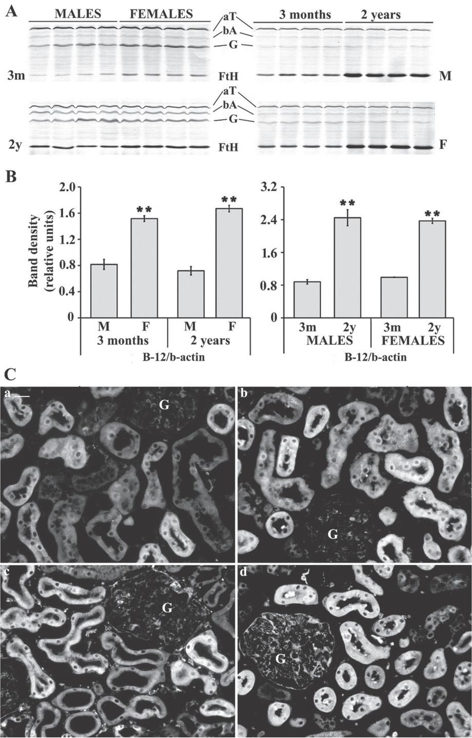 Immunochemistry of the heavy ferritin chain in the kidney. Western blotting with B-12 antibody against FtH (A), and densitometric evaluation (B) of the protein bands. FtH immunostaining in cryosections of the kidney tissue of three-month (3m) and two-year (2y) old male (M) and female (F) (C). The strong protein represents FtH and was used for densitometric evaluation in relation to beta-actin (bA) (A). Higher expression of FtH is visible in female rats regardless of age and in 2-year-old male and female animals. Each band represents FtH protein expression in tissue homogenates from individual animals. Densitometric evaluation of protein bands (B) is shown by bars, each bar representing mean ± SEM of band density of four animals per group. Statistics: vs respective M or 3m old animals, **P <0.01. Immunohistochemical images of FtH in kidney tissue cryosections (C) show similar findings in 3m (a, b) and 2y (c, d) old M (a, c) and F (b, d) rats. Intracellular staining is stronger in 3m old F vs 3m old M (a, b), 2y old F vs 2y old M (c, d), 2y old M vs 3m old M (a, c), and 2y old F vs 3m old F (b, d). Glomeruli (G) are marked on panel (C) and in c (2y M) and d (2y F) and are better stained in 3m M and F (a, b) (possibly present in podocytes, mesangial cells or/and parietal layer). Bar=20 μm
