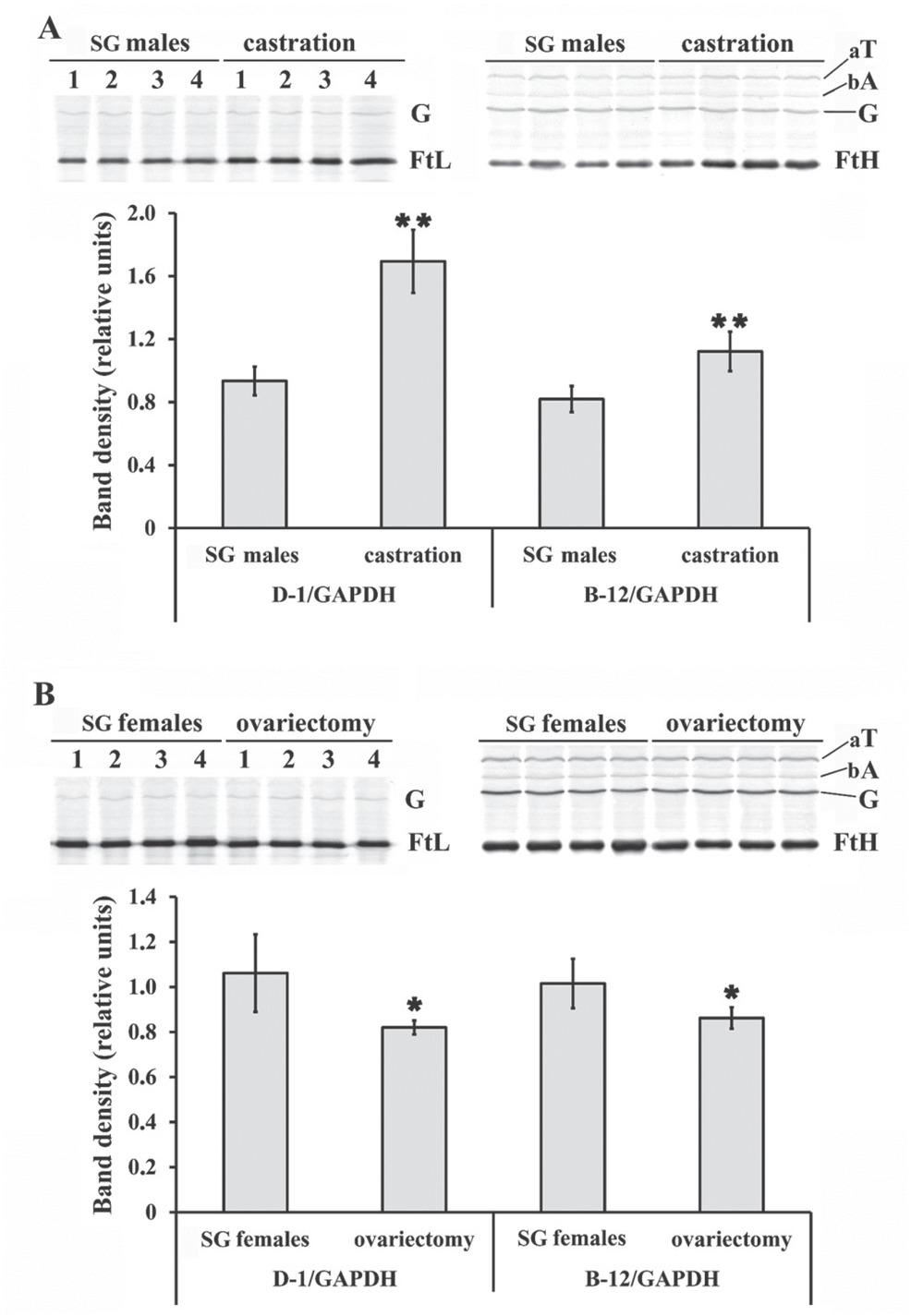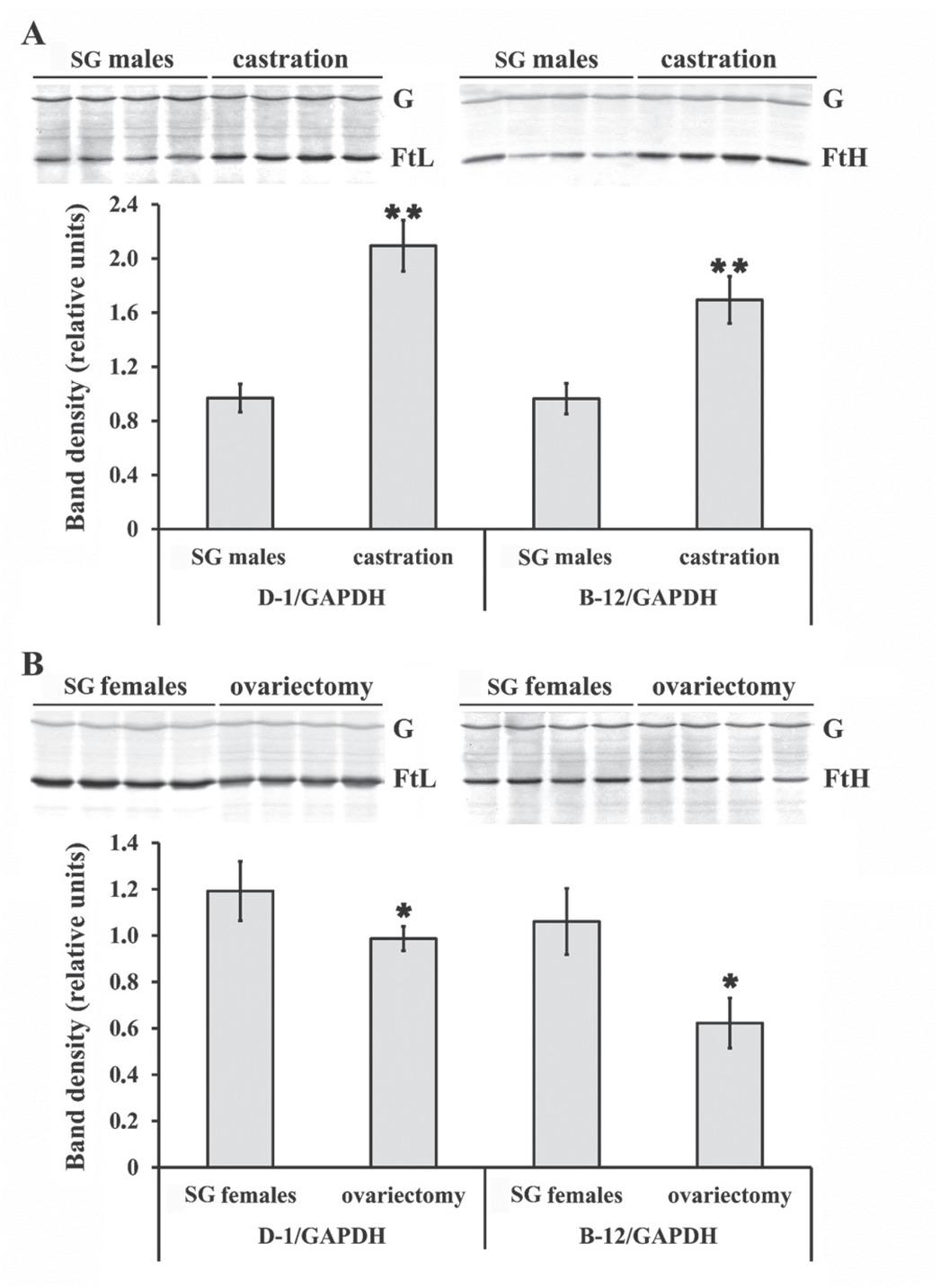 Effect of gonadectomy on both ferritin chain expression in the liver. Expression of FtL and FtH protein (A, B) in the liver by western blotting. Each band represents FtL or FtH expression in the tissue of individual animals. Additional protein bands are from alpha-tubulin (aT), beta-actin (bA), and GAPDH (G). Each bar represents mean ± SEM of band density from four animals per group. Data were analysed with the t-test. Ovariectomy statistically decreased the expression of both ferritin chains and castration increased their expression. Statistics: sham-gonadectomised (SG) vs castrated males **P<0.01 (A); SG vs ovariectomised females *P<0.05 (B)