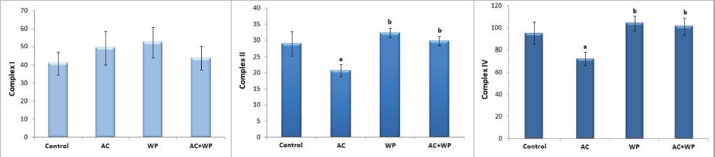 Decreases in OXPHOS complex II (38.28 %) and IV (23.82 %) levels in AC-treated rats were significant compared to control, and both were significantly improved by treatment with WP alone or in combination with AC, which increased complex II by 55.48 % and 42.87 %, respectively and complex IV by 43.95 % and 39.84 %, respectively compared to the AC group (Figure 3).