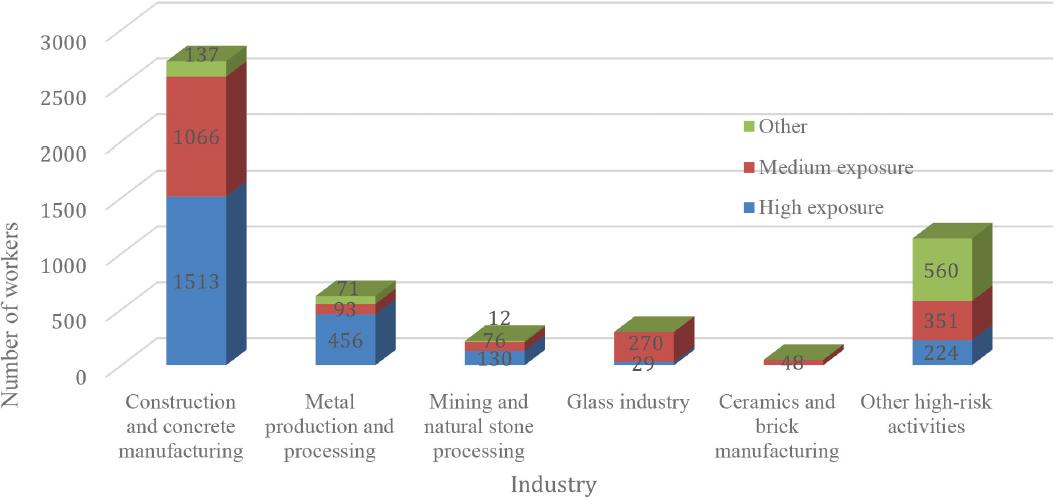 Only 36.5 % (N=101) of the respondents reported that their workers were regularly or occasionally exposed to silica, 2,072 in total, most of whom come from the construction industry. However, the highest share of exposed workers (as self-reported by respondents) comes from the glass industry (29.3 %; Table 1).