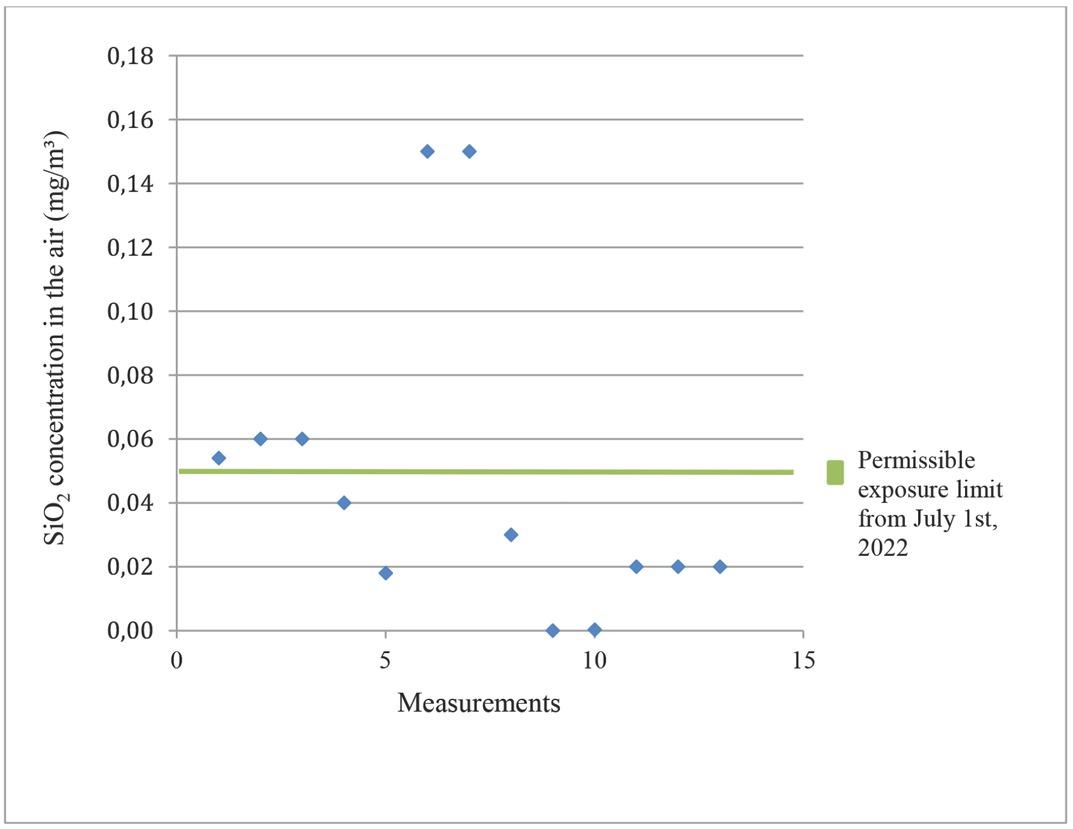 Only 23 respondent companies (8.3 %) provided data on dust concentration measurements carried out at 57 work posts. The concentration of silica was measured by only five companies (1.81 %) for at 13 work posts, one of which measured the percentage of RCS. None of these companies is in the construction business. The current exposure limit was exceeded in five silica measurements (locations) (Figure 2).