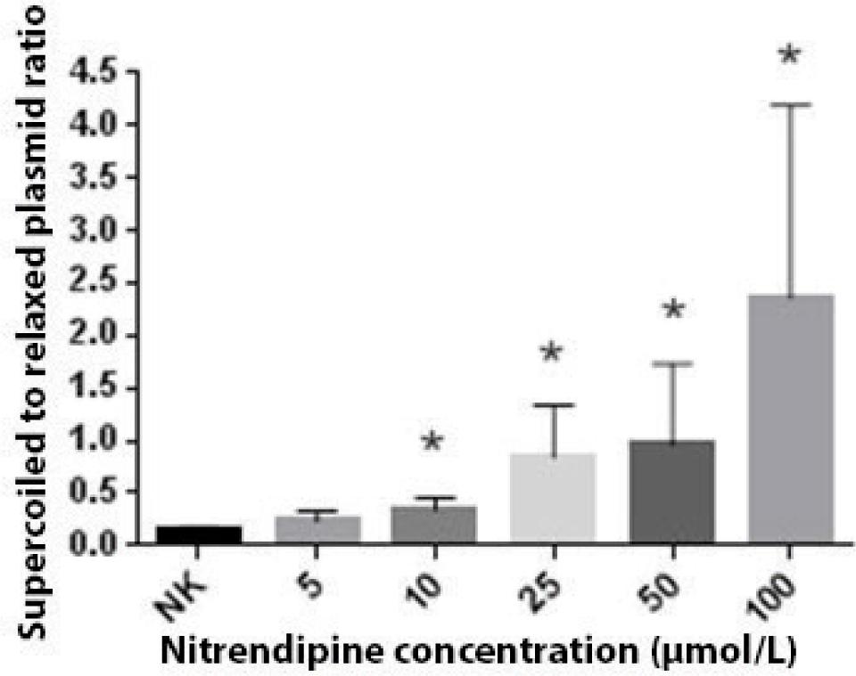 Protective effects of nitrendipine against pTZ57R DNA plasmid damage caused by Fenton reaction products. The pTZ57R DNA plasmid (1.4 μg) was incubated for 30 min with 0.003 % H2O2 in 0.01 mmol/L FeSO4 with no or 5, 10, 25, 50 or 100 µmol/L nitrendipine And electrophoresed following the standard procedure. NK – negative control
