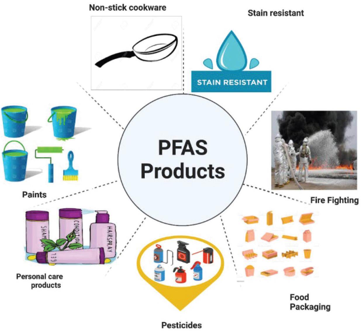 Per- and polyfluoroalkyl substances (PFAS) are a large group of over 9,000 fluorinated carbon compounds used in a wide range of industrial and consumer applications thanks to their heat resistance, non-degradability, and hydro- and oleo/lipophobicity. Industrial applications include aqueous film-fighting foams, coatings, and surfactants, whereas consumer applications include non-stick cookware, shampoos, cleaners, paints, and food packaging materials (1–4) (Figure 1). Their continued consumer and industrial use have made PFAS a major environmental and human health concern, as they contaminate soils, groundwater, rivers, lakes, drinking water, and the atmosphere.