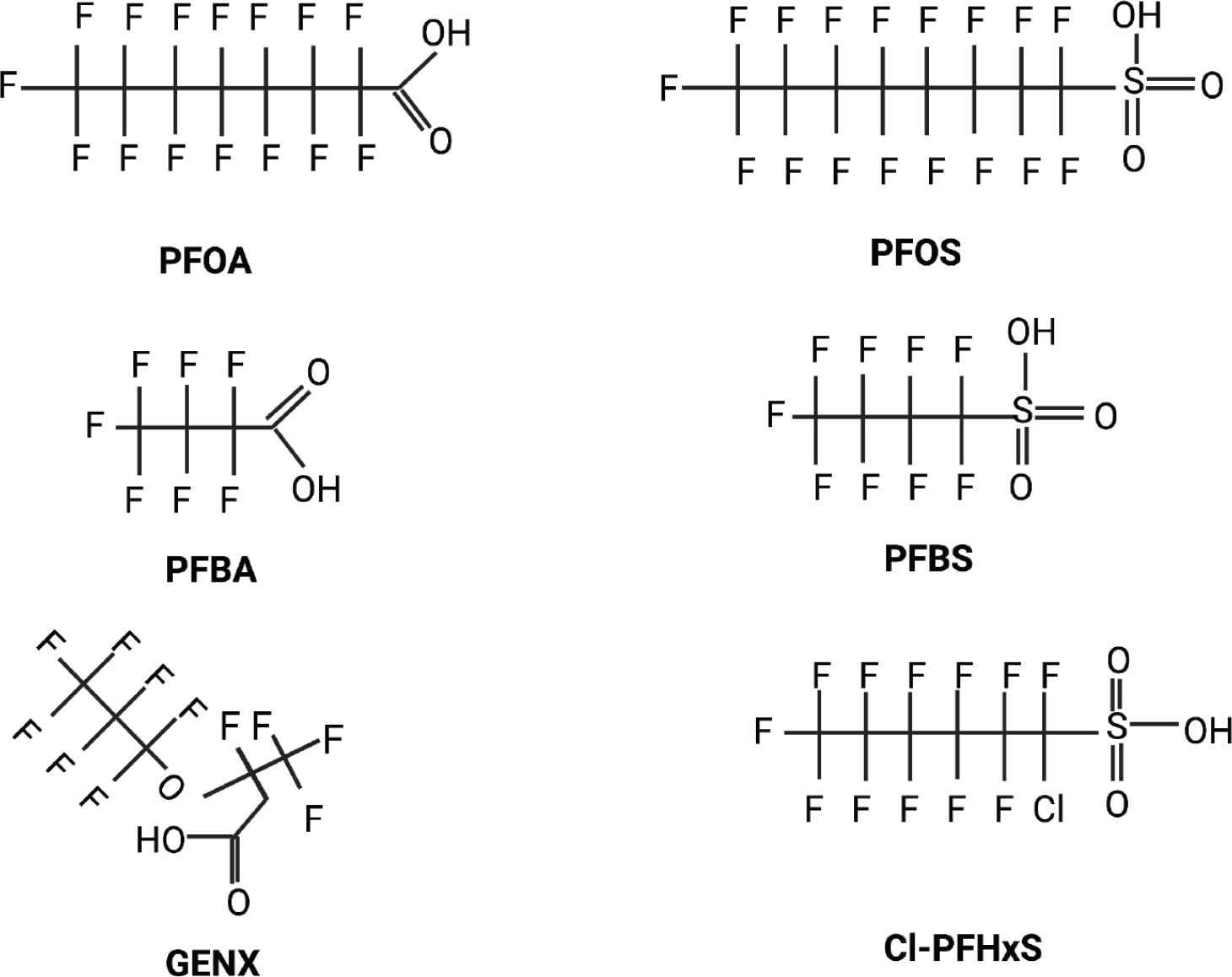 Chemical structure of some common long- and short-chain PFAS. PFOA – perfluorooctanoic acid (long-chain); PFOS – perfluorooctane sulphonate (long-chain); PFBS – perfluorobutane sulphonate (short-chain); PFBA – perfluorobutanoic acid (short-chain); GenX – hexafluoropropylene oxide dimer acid; PFHxS –1-chloro perfluorohexane sulphonate