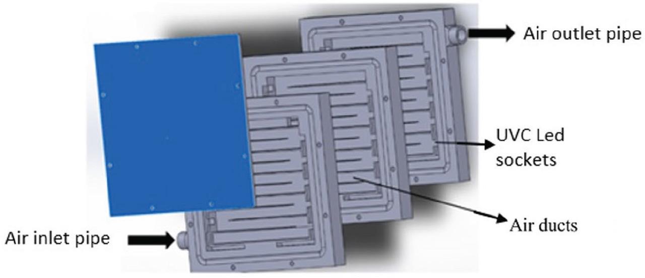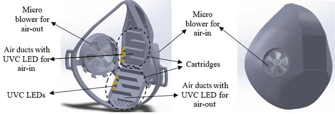 Figures 1–3 show the design of the face mask with detailed depiction of the UVC LED cartridges. The air is inhaled and exhaled through inlet and outlet air ducts in the cartridges whose air flow is adjusted with micro blowers to 5–10 L/min by changing the rotation speed.