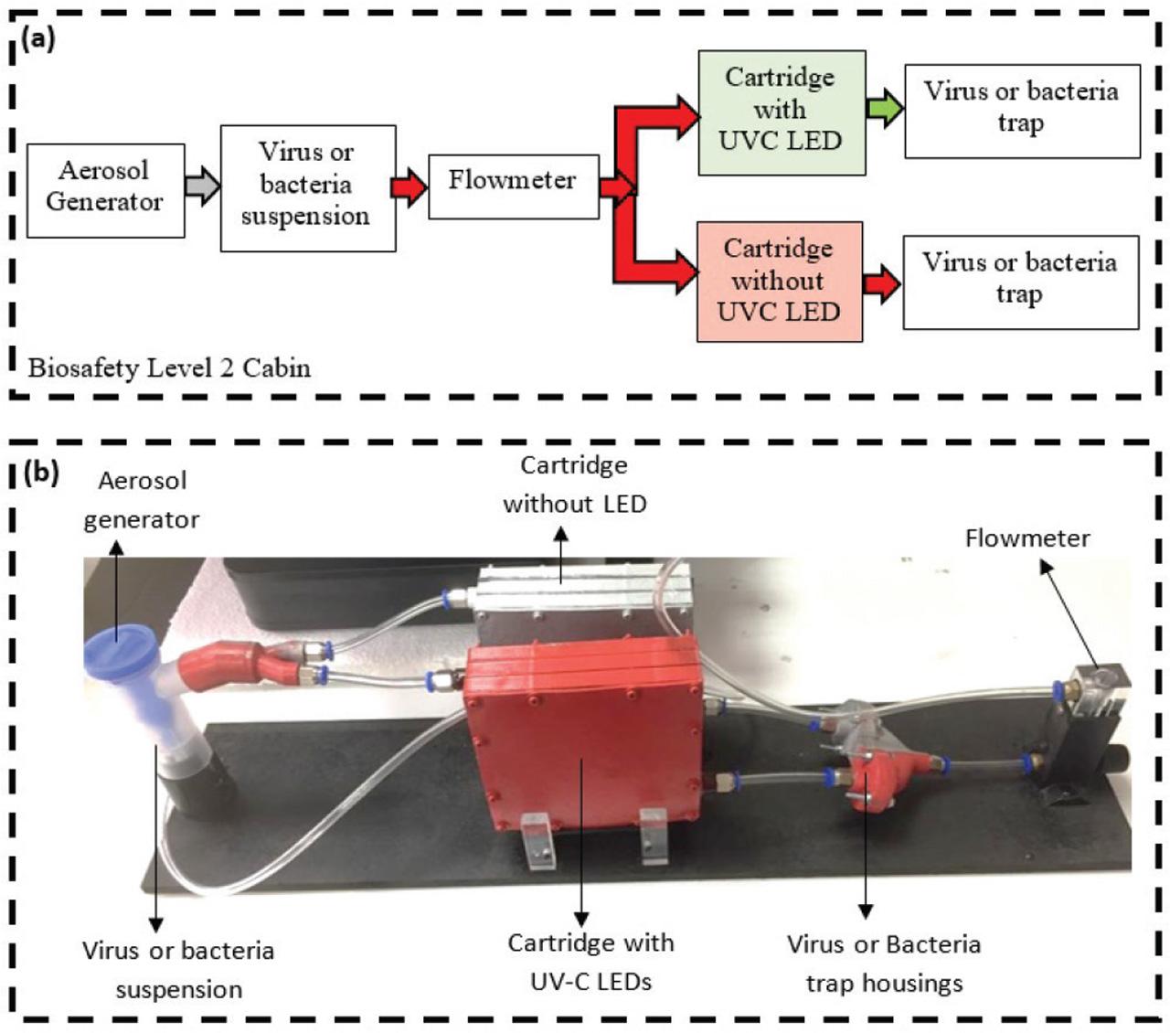 Our design, in turn, uses a cartridge containing UVC LED lamps. The aim of this preliminary study was to see how effective this face mask and the cartridges would be against two most common causes of hospital infections, the gram-positive Staphylococcus aureus and gram-negative Pseudomonas aeruginosa, and an enveloped RNA influenza virus A/Puerto Rico/8/1934 because of its similarity with the severe acute respiratory syndrome coronavirus 2 (SARS CoV-2) responsible for the COVID-19 pandemic. Our hypothesis was that the emitted UVC LED light placed in the cartridges would suffice to destroy these three pathogens.