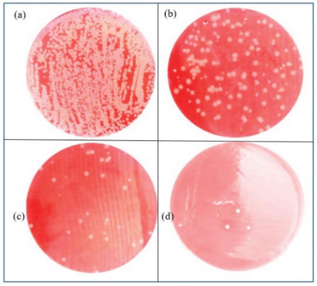 Efficiency against S. aureus with the three-layer cartridge and varying UVC light power, (a) no UVC light, (b) 50 mW, (c) 100 mW, and (d) 150 mW