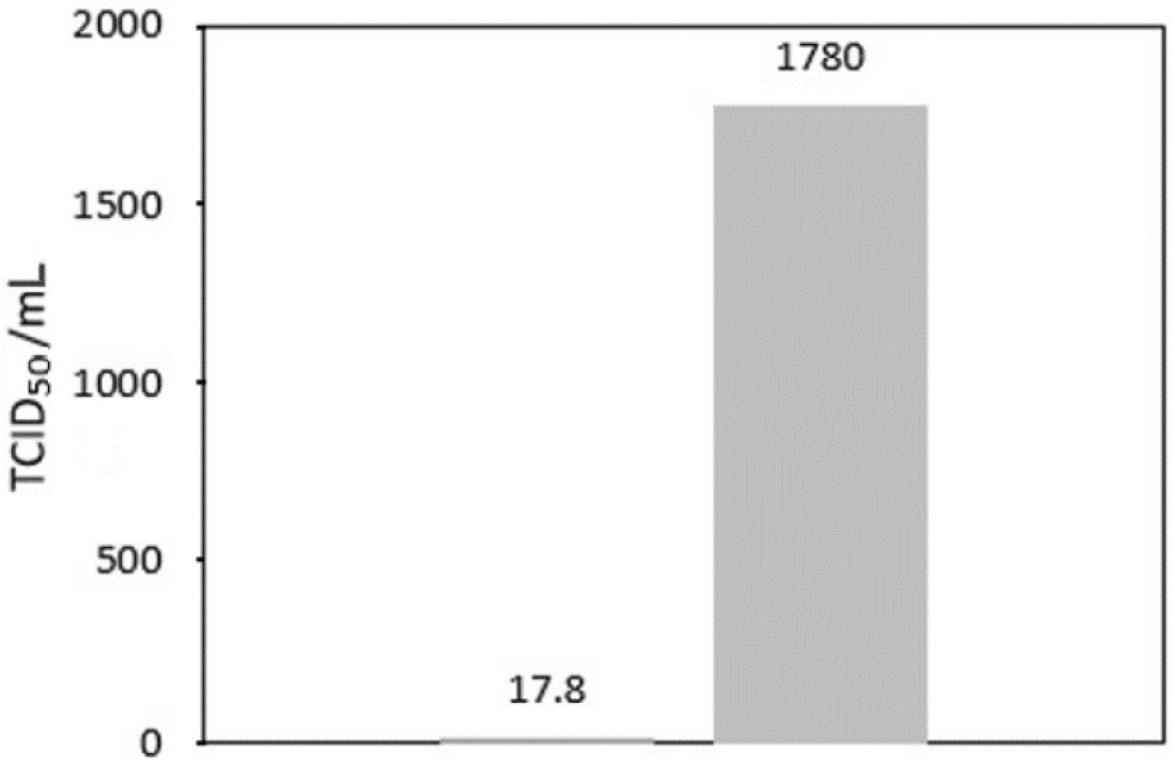 Comparison of viral titres (TCID50/mL) obtained with the active (75 mW) one-layer cartridge (left column) and control (no-LED) cartridge (right column)
