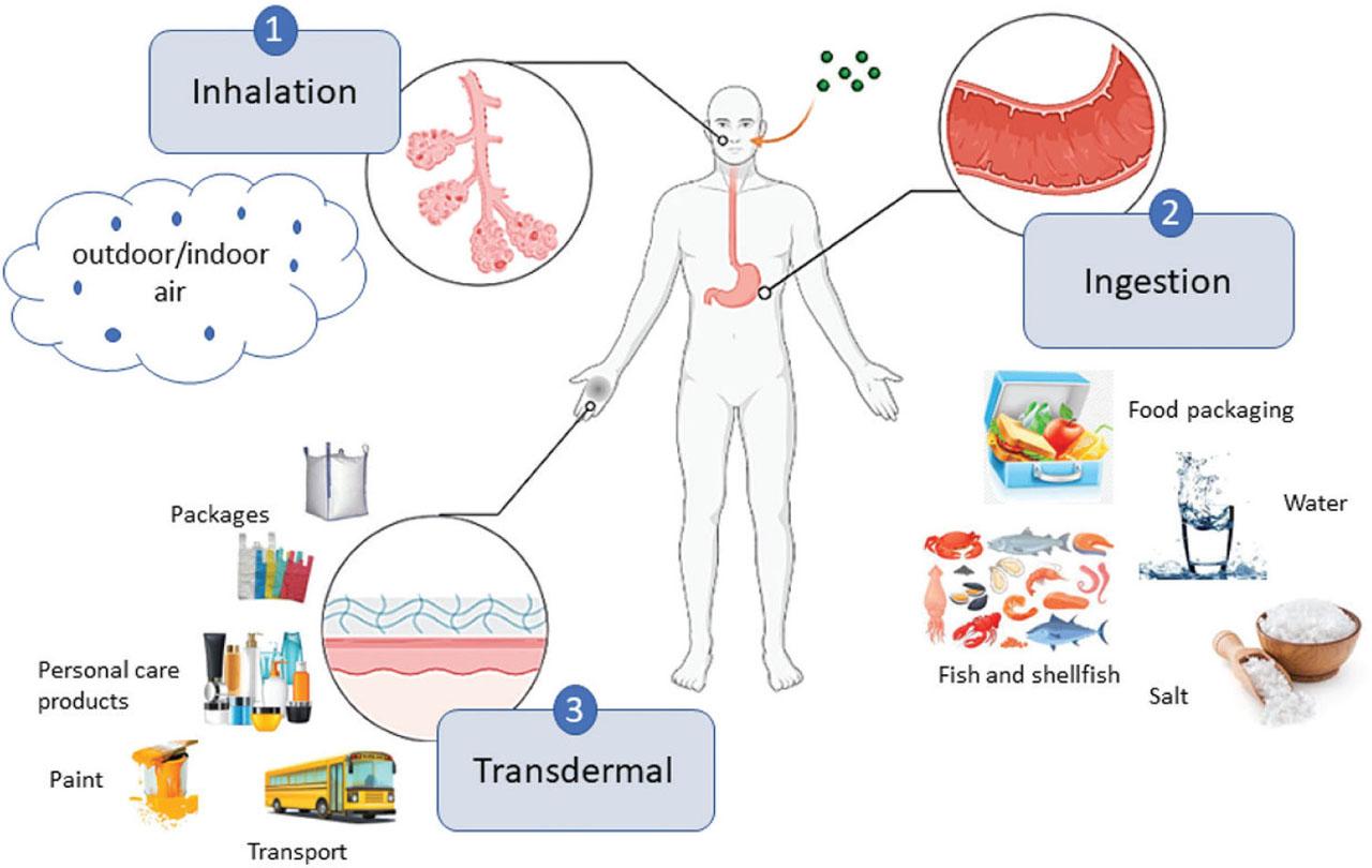 | Human exposure | Ingestion route: ≤30 particles/day from tap water and beverages, 37–100 particles/year from sea salt; in total ≤250 pg/kg body weight per day for an adult from tap water, beverages, and sea salt | (11) |