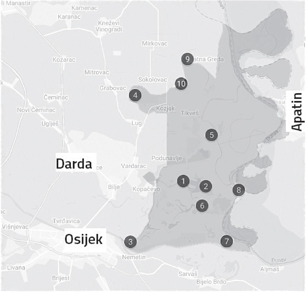 Sampling sites (1–10) within the Kopački Rit Nature Park (shaded)